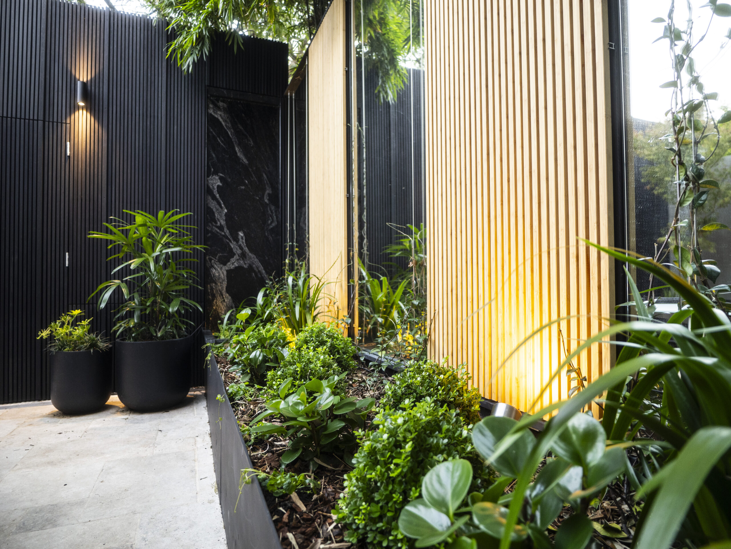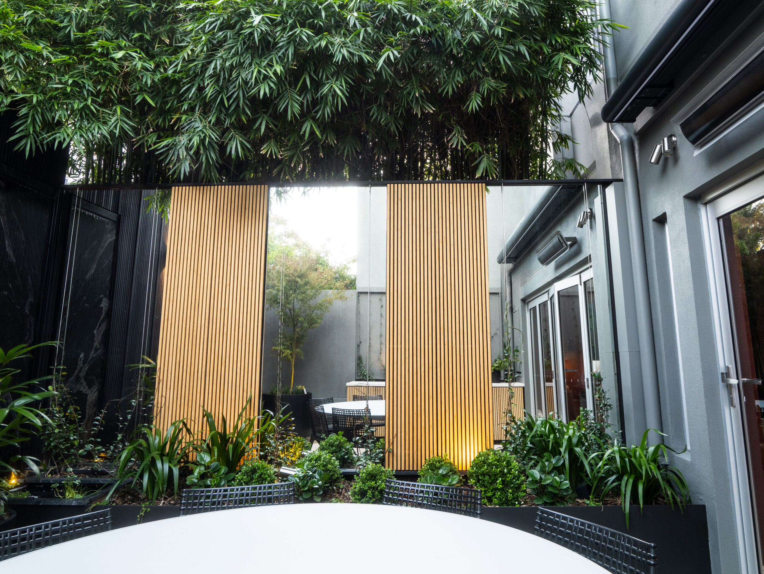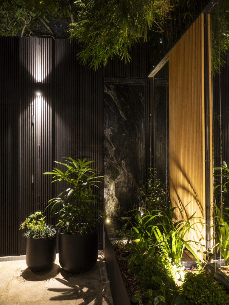 House of Bamboo’s SeaChange Series battens, in Black Torquay, Noosa Natural, and Black finishes, frame the courtyard with architectural precision, creating a striking contrast to the lush planting palette. Vertical mirrors and bespoke black metal troughs expand light and space, reflecting seasonal textures from clipped Buxus japonica to the vibrant foliage of a Japanese Maple.